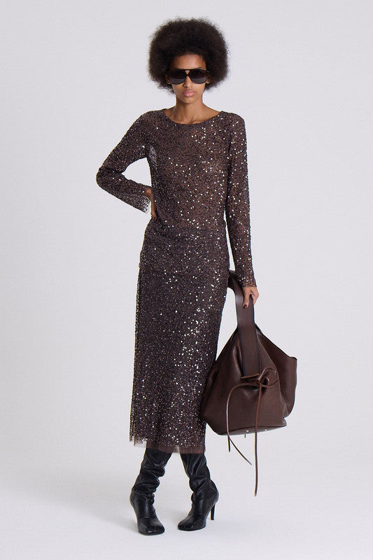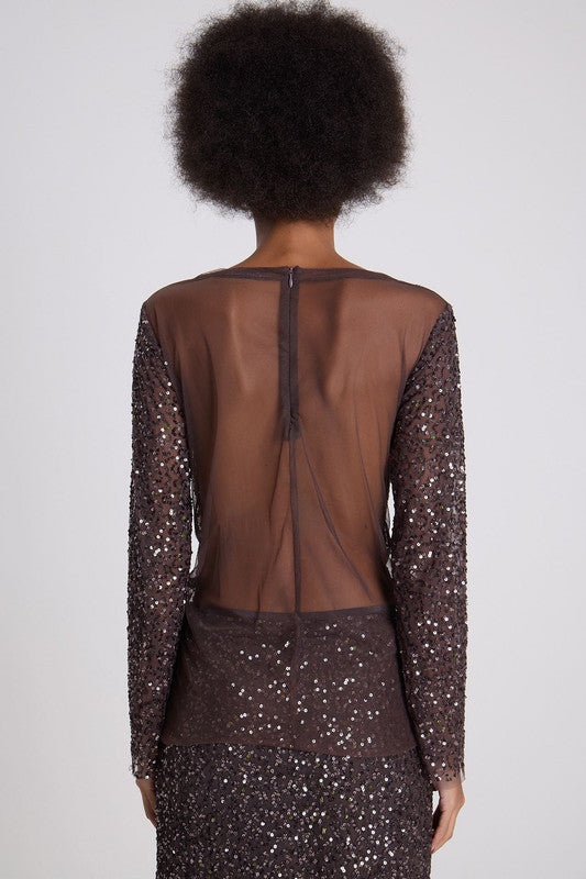Top De Tul De Mangas Largas Con Lentejuelas Bordada. Silueta Fitted.