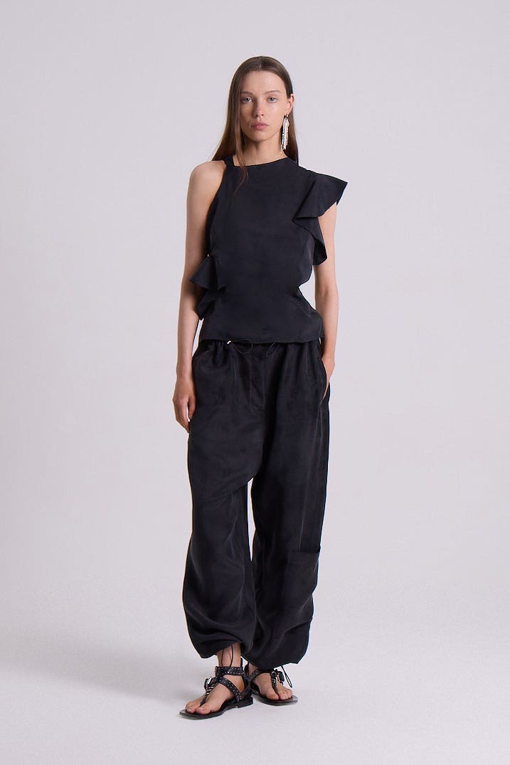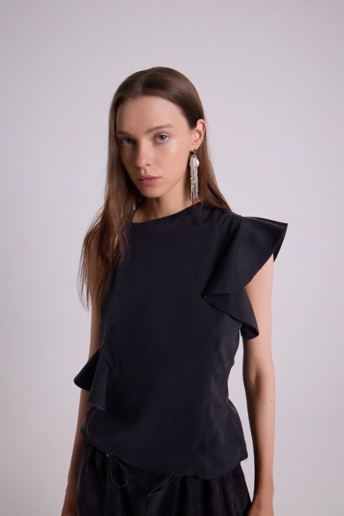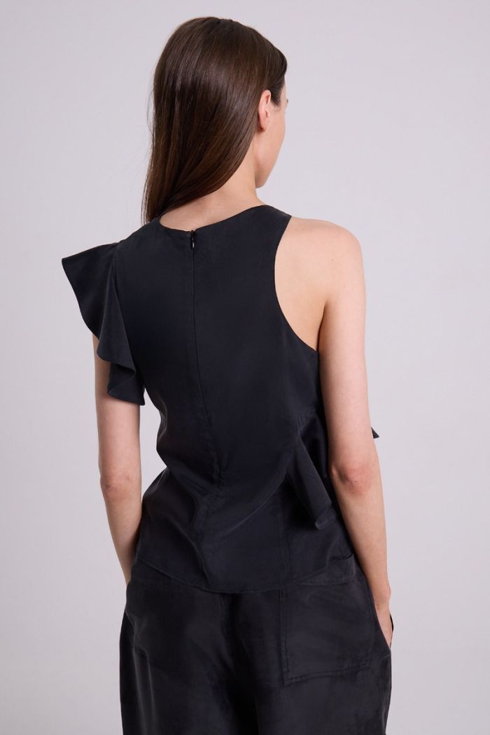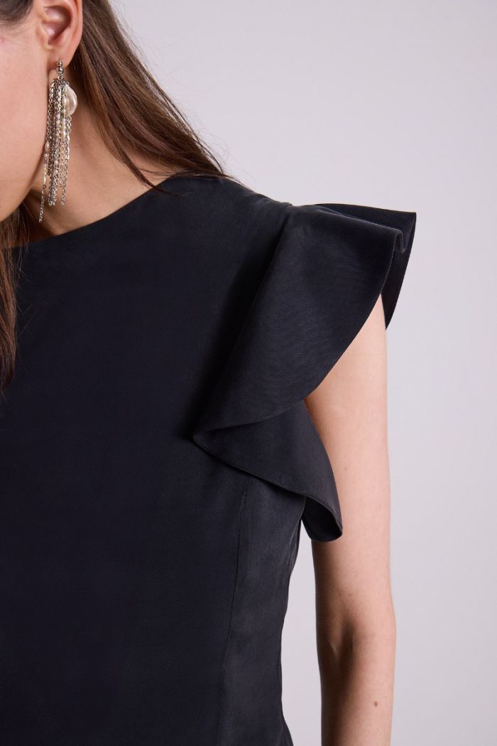 Top De Cupro Con Spandex. Con Volados En Manga Y Lateral Derecho. Acceso Por Cierre Invisible 64%Cupro 32%Viscosa 4% Spandex