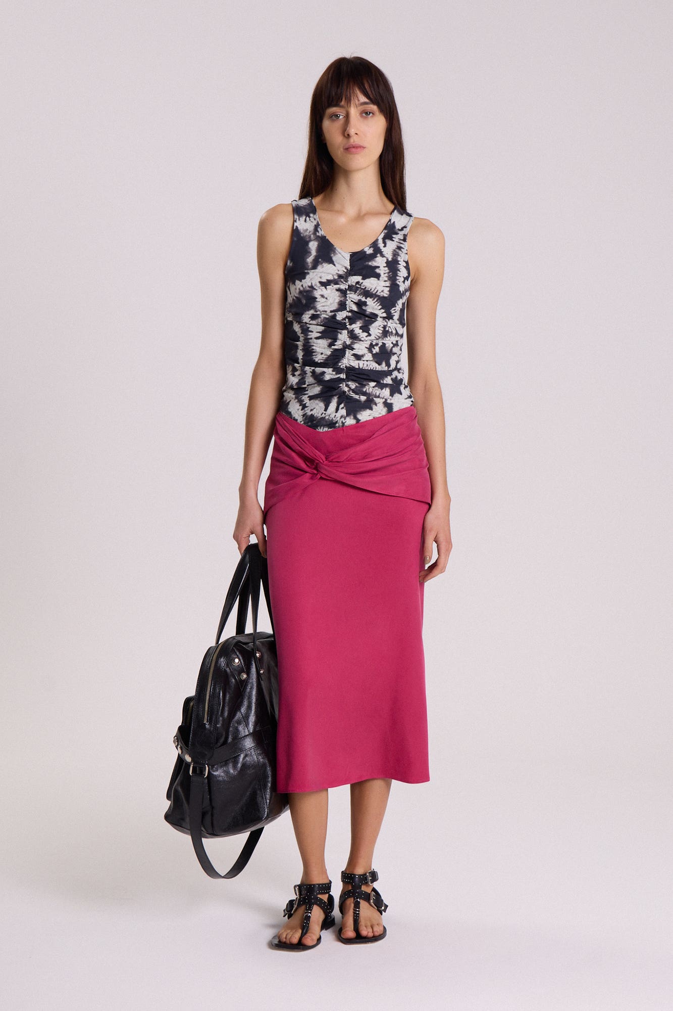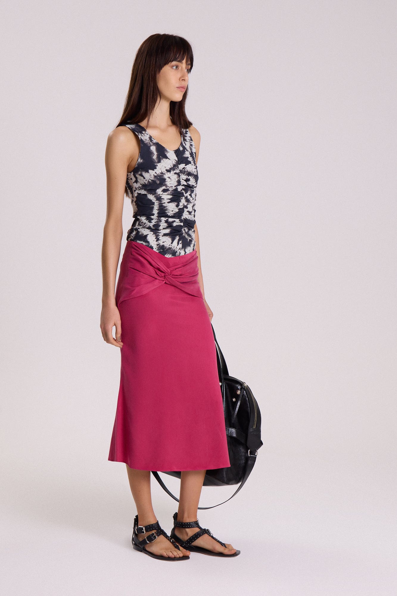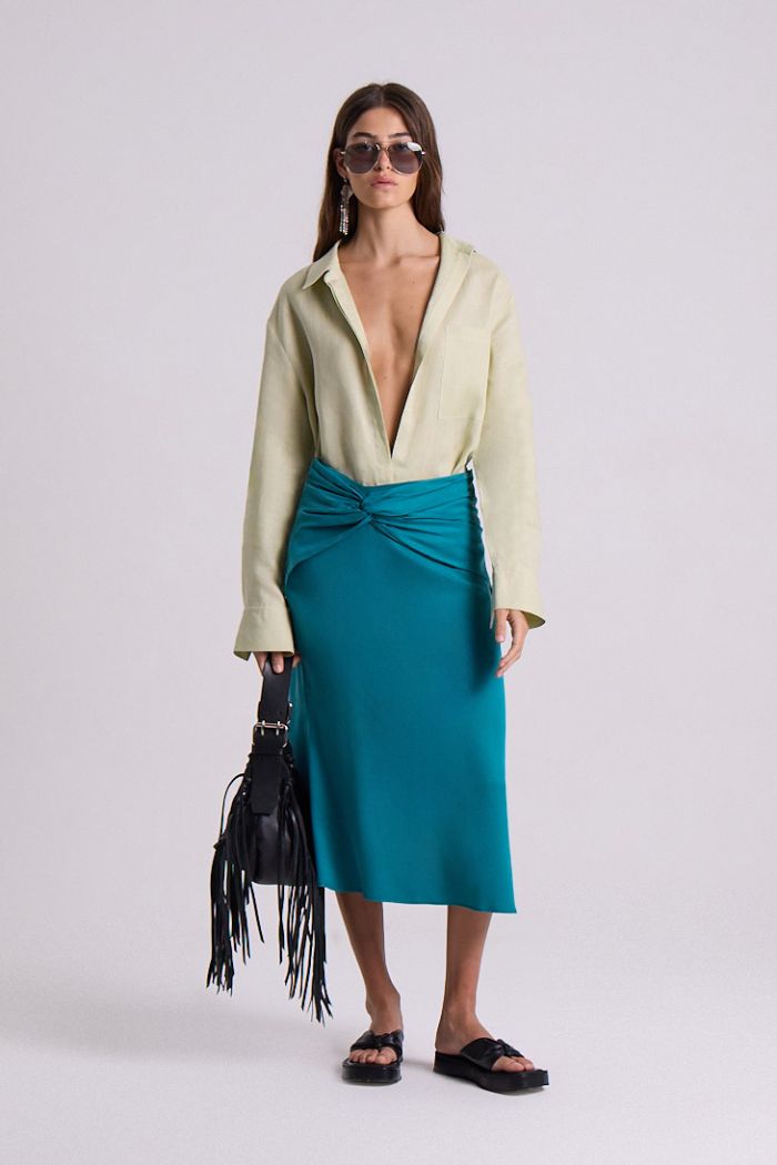 Pollera De Cupro Con Spandex. Largo Midi. Acceso Con Cierre Invisible. Nudo En Delantera Con Frunces. 64%Cupro 32%Viscosa 4% Spandex
