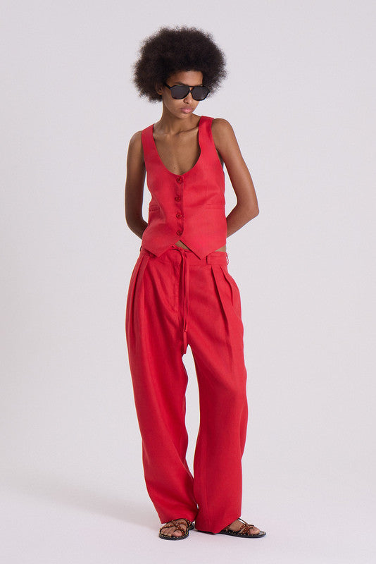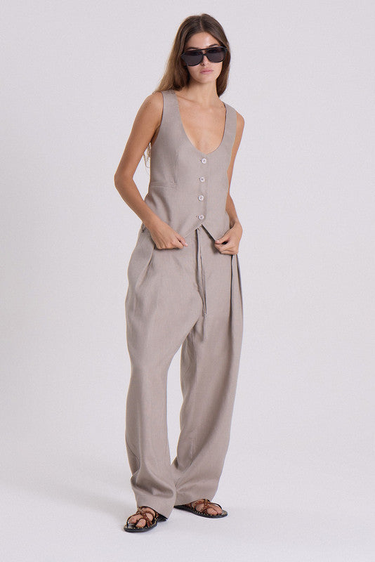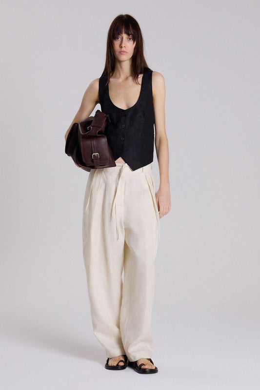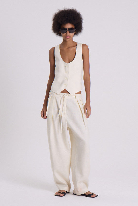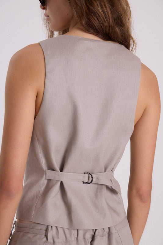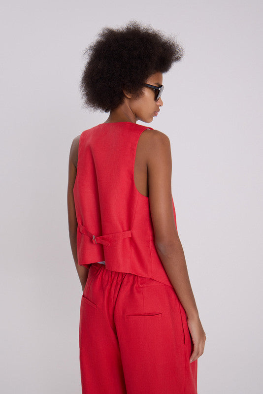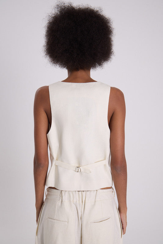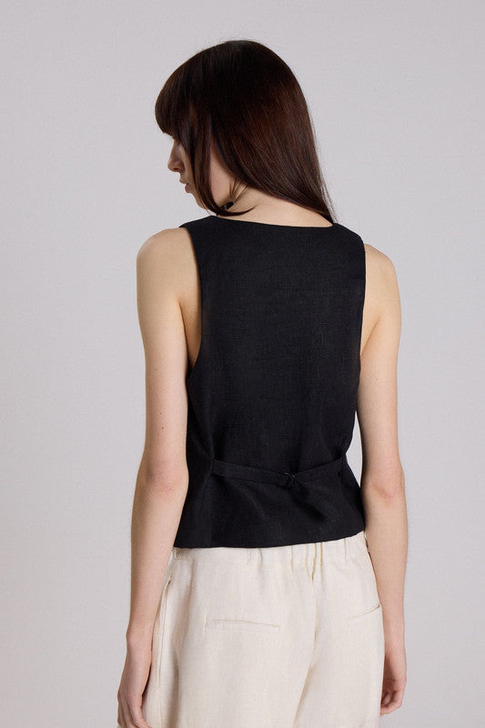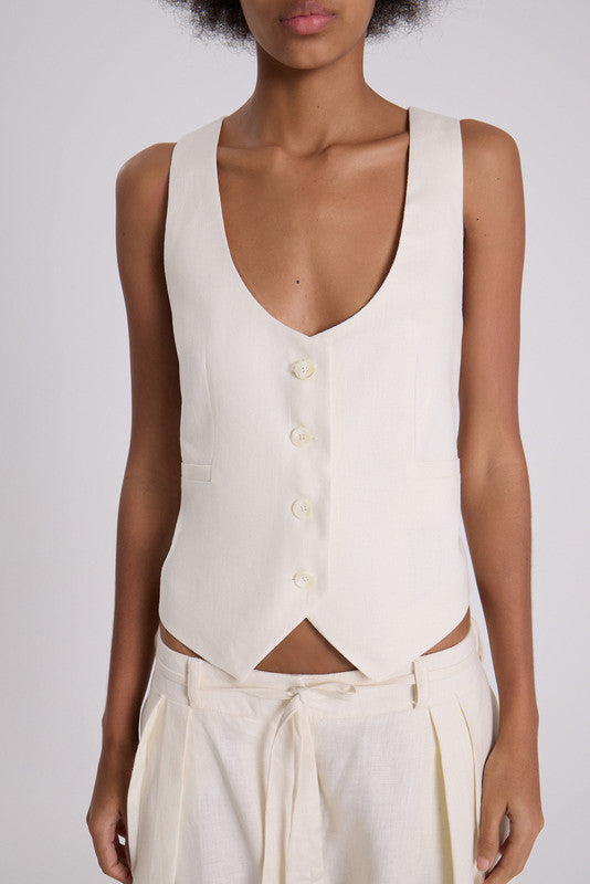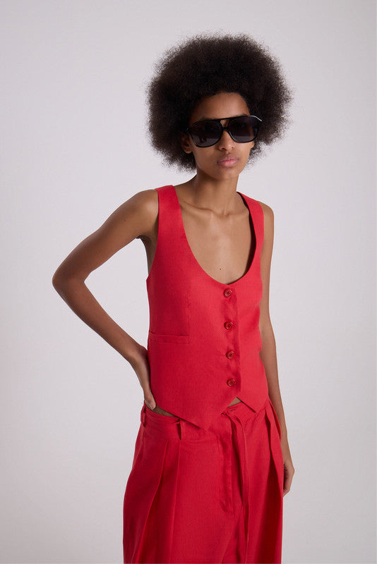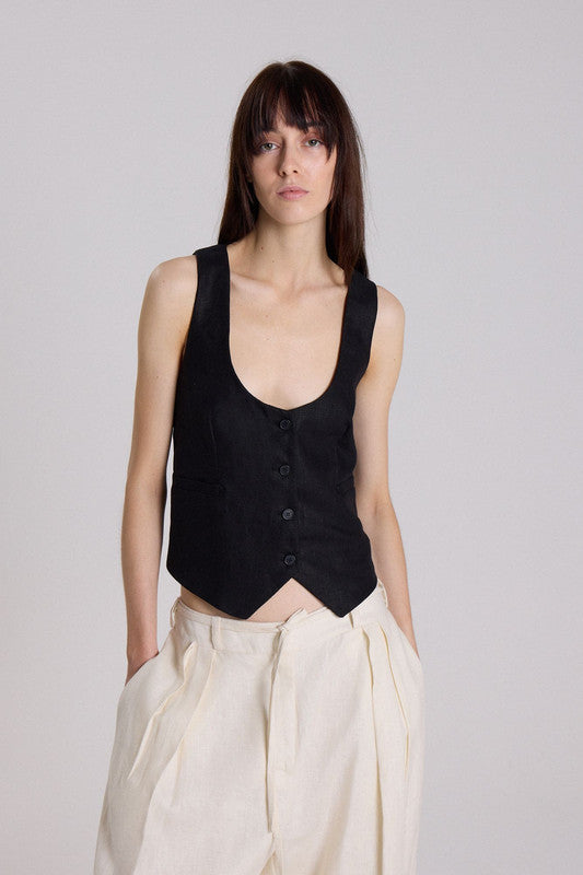 Este Chaleco De Lino Presenta Una Construcción Precisa, Con Escote Profundo Y Abotonadura Frontal Que Dibuja Una Línea Alargada En El Torso. Los Bolsillos Simulados Marcan Un Detalle Sastrero, Mientras Que El Bajo Con Puntas Genera Un Corte Nítido Que Estiliza. Su Carácter Está En La Versatilidad: Puede Llevarse Sobre La Piel, O Bien Como Capa Intermedia Bajo Un Blazer, Aportando Estructura Sin Rigidez.. Lino 100%
