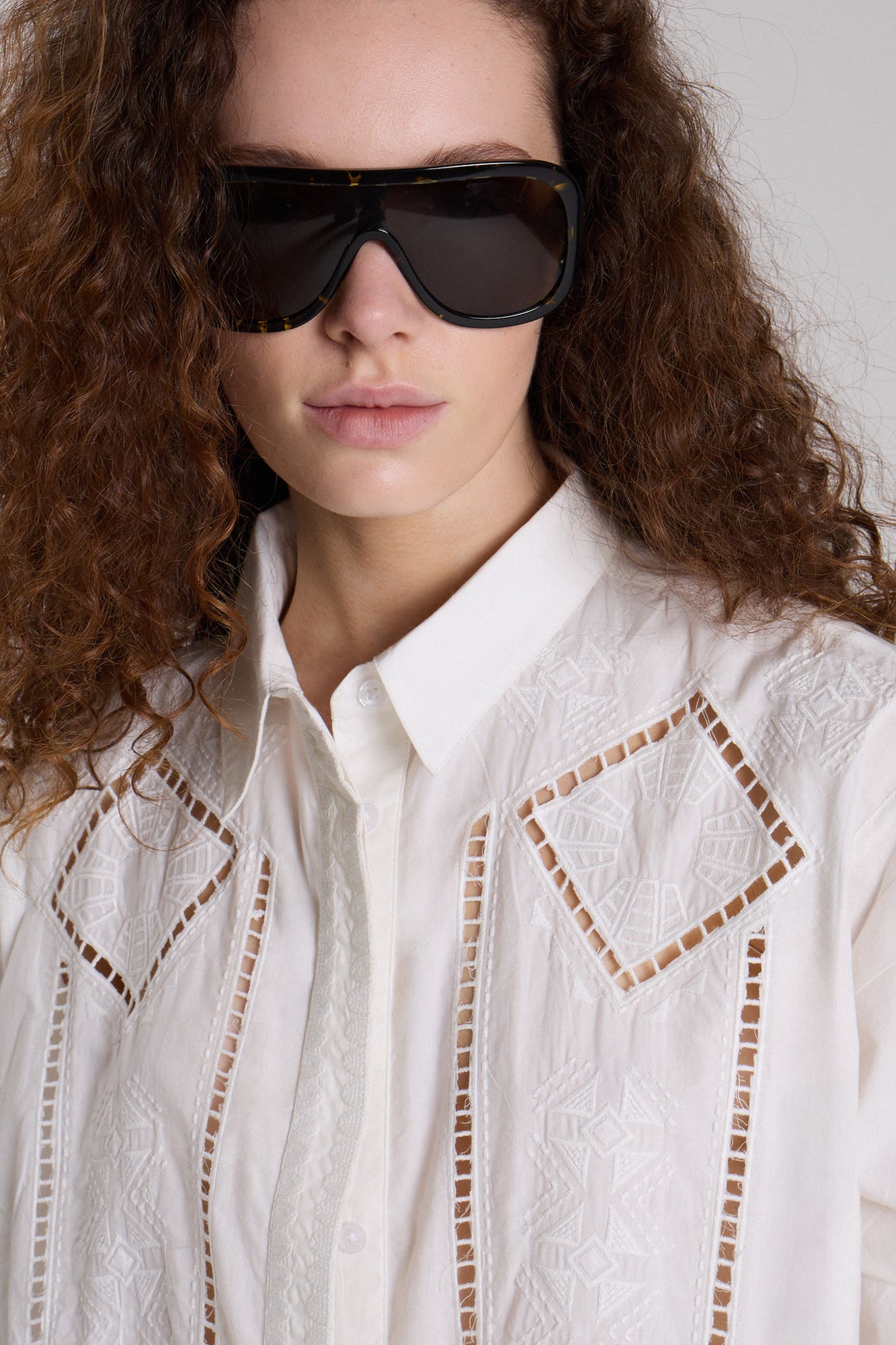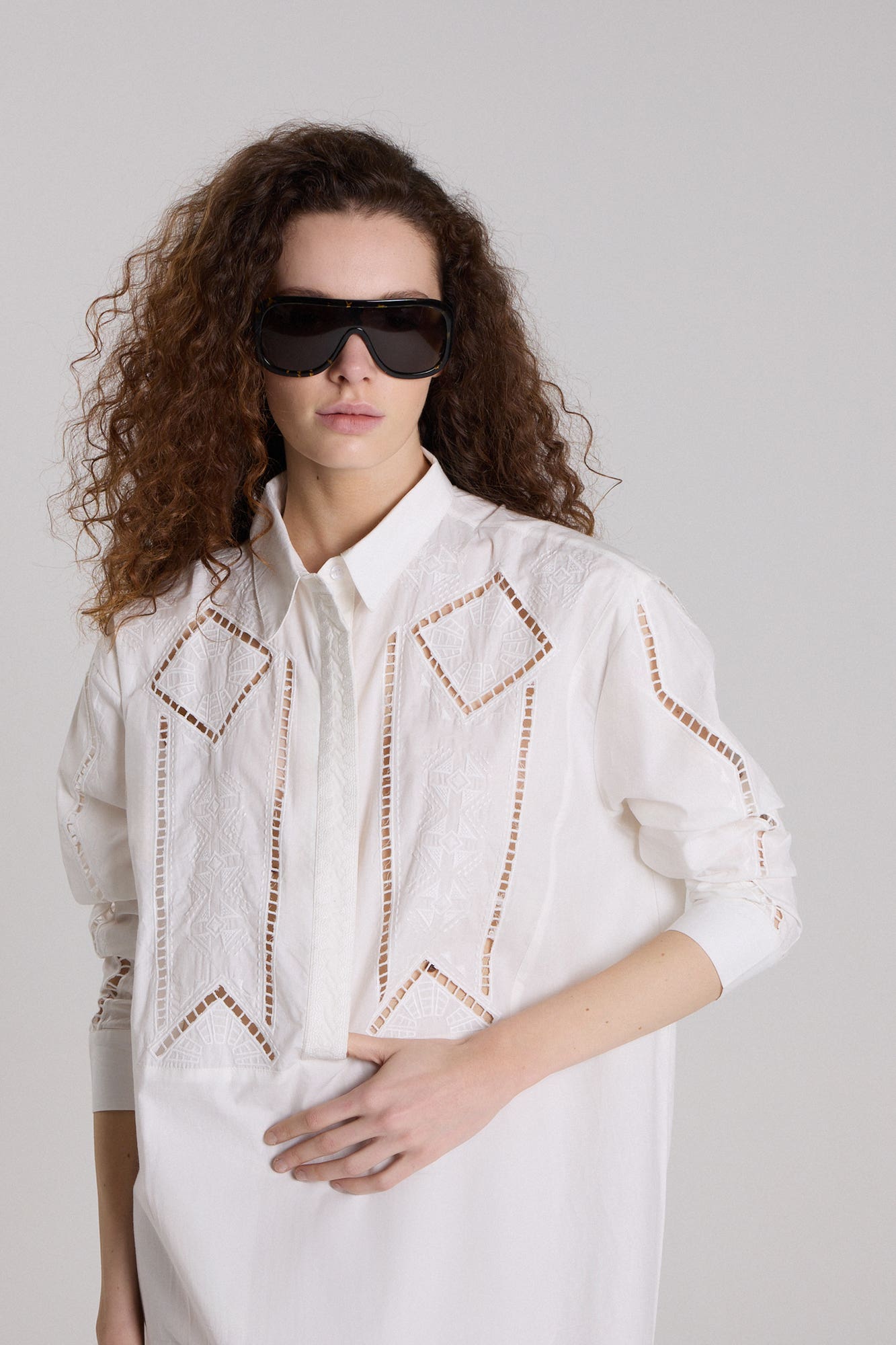 Túnica 100% Lino De La Línea Monochrome. Silueta Entre Blusa Y Camisa Con Mangas Balloon Y Puño Camisero. Escote En V Amplio, Pechera Frontal Y Cartera 3/4 Con Presilla Decorativa. Fresca Y Femenina, Ideal Para El Verano.