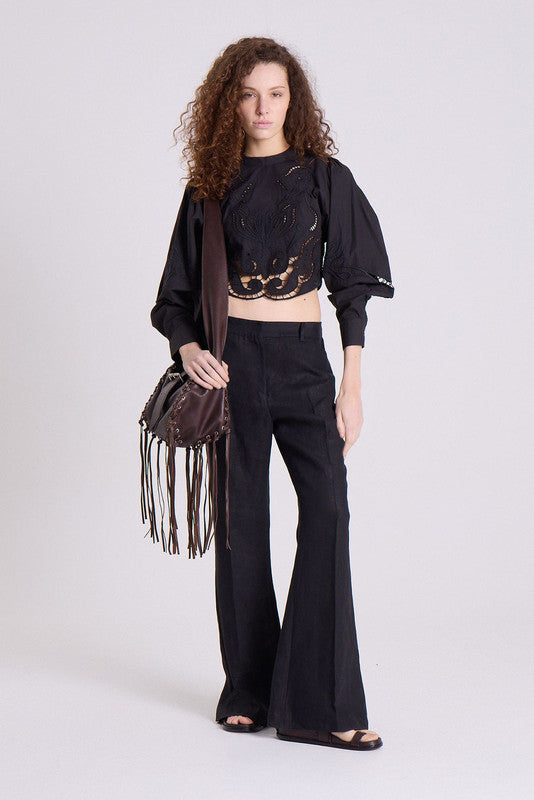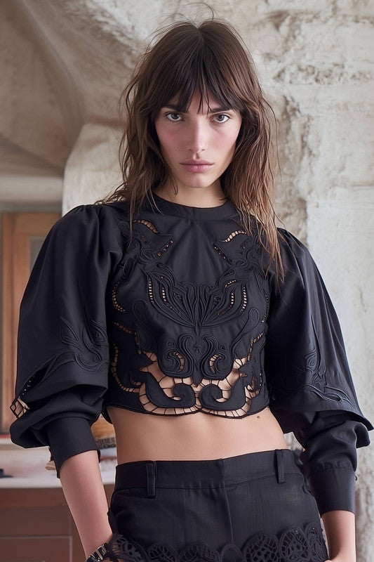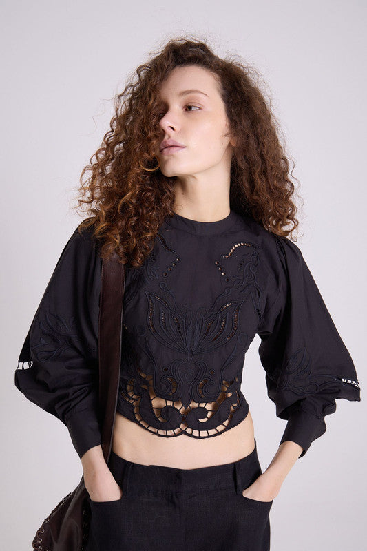 Top En Poplín De Algodón Blanco Con Bordado Calado De Inspiración Botánica. Su Diseño Recortado Realza La Cintura Y Las Mangas Abullonadas Aportan Un Aire Romántico Y Moderno. Una Pieza Que Une Tradición Artesanal Y Estilo Contemporáneo. 100% Algodón.