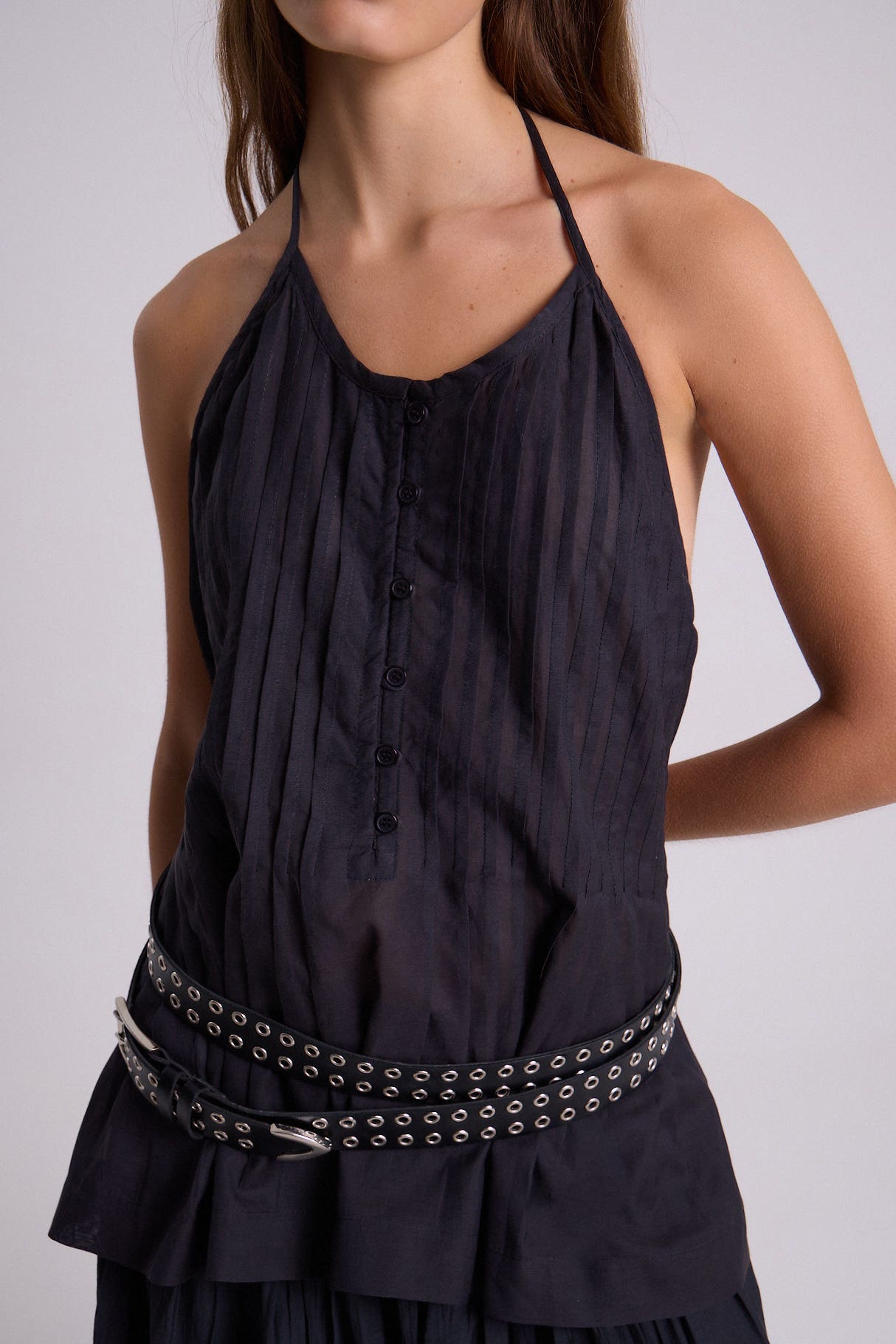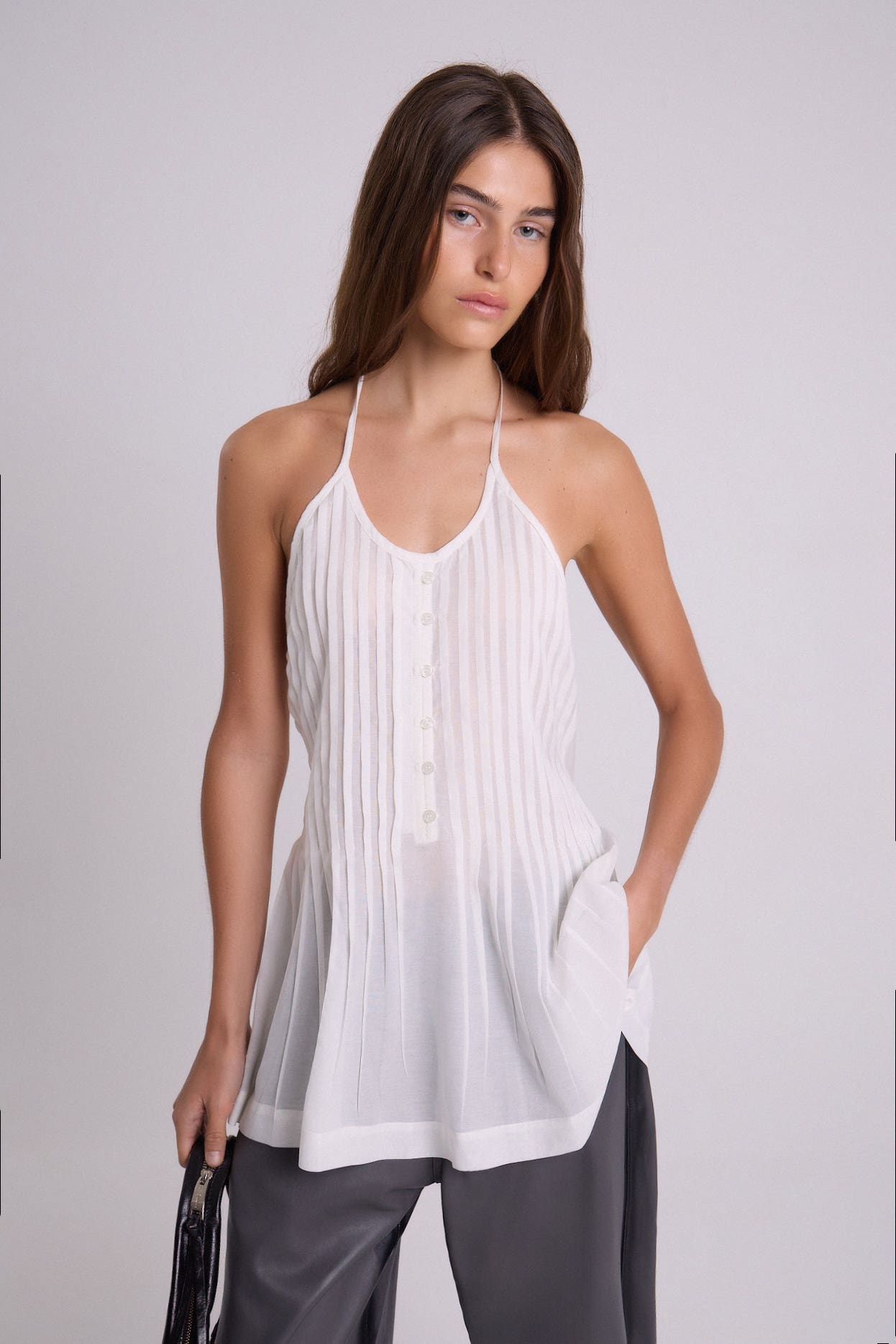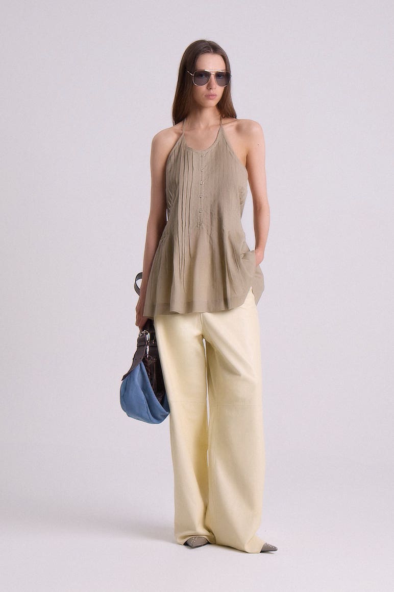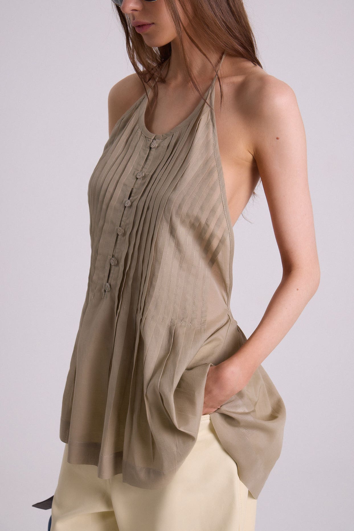 Top Con Tablas En Delantero Y Frunce. Se Ata En Cuello Con Un Bretel. Tiene Cartera Y Botones En El Delantero. 55% Algodón 45% Viscosa