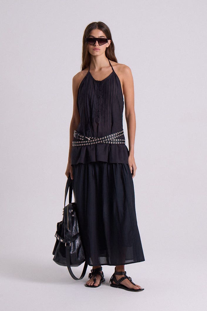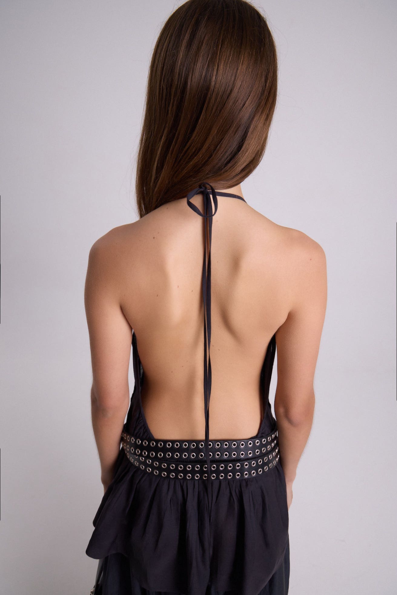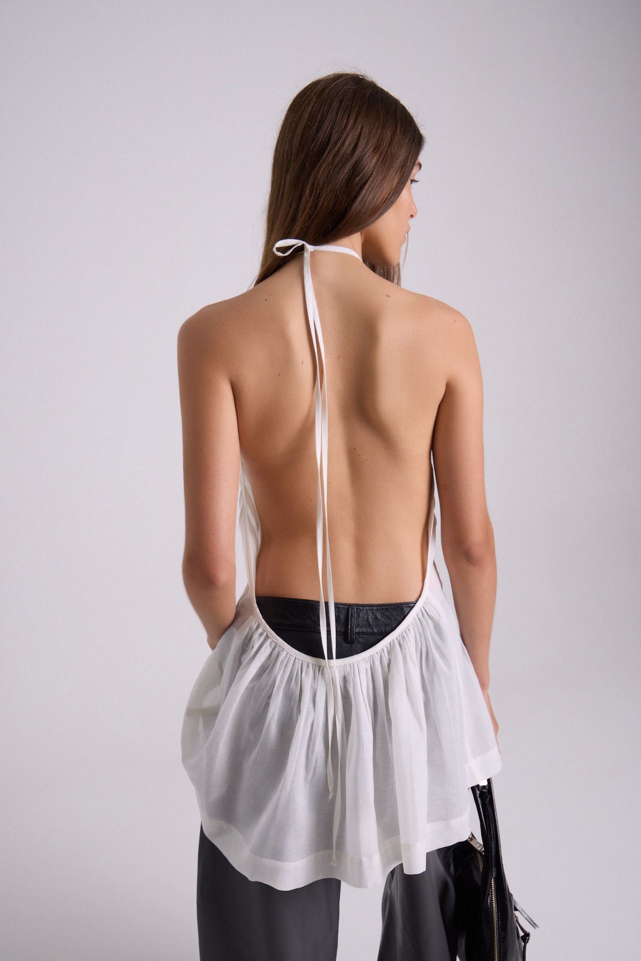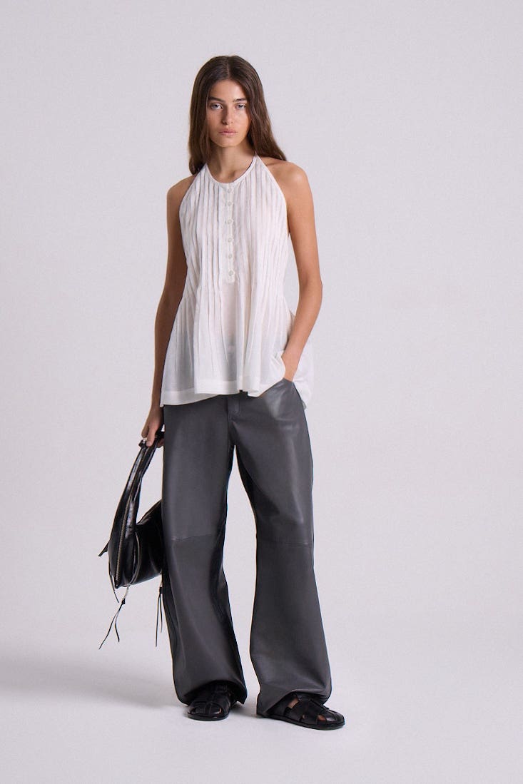 Top Con Tablas En Delantero Y Frunce. Se Ata En Cuello Con Un Bretel. Tiene Cartera Y Botones En El Delantero. 55% Algodón 45% Viscosa