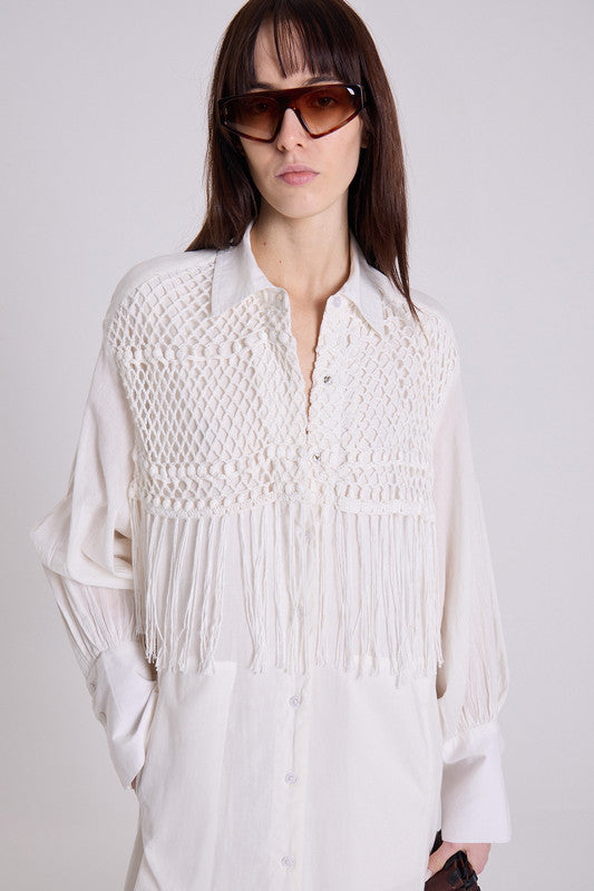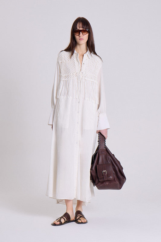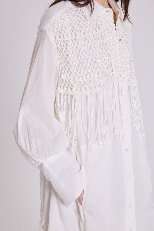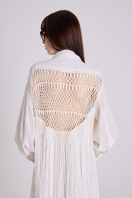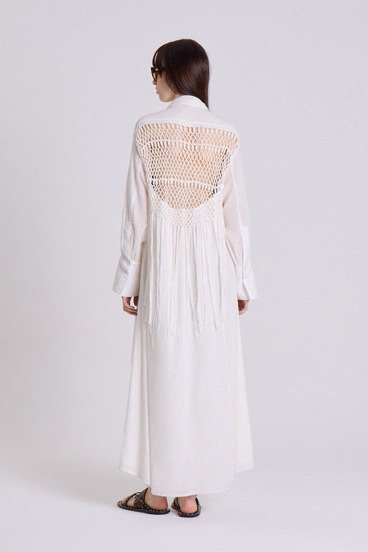 Vestido Estilo Camisero Largo Con Pechera De Red En Algodón. Posee Pechera De Macramé Tejida A Mano Con Flecos En Delantero Y Espalda. La Prenda Esta Forrada Con Algodón. El Calce Es Oversize. Tiene Puños Con Botones. Algodón 100%