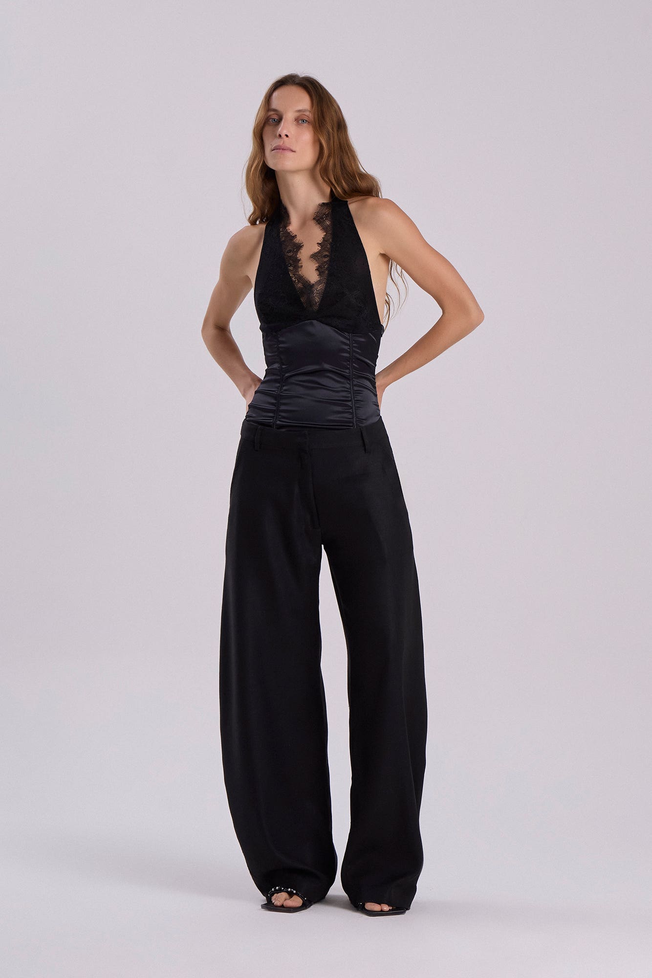 Body Halter De Satén De Punto En Combinacion Con Encaje, Fit Al Cuerpo. Escote De Encaje. Detalle De Recortes Corseteros. Espalda Abierta. Acceso Inferior Con Broches En El Tiro. Poliester 88% Elastano 12% Con Puntilla