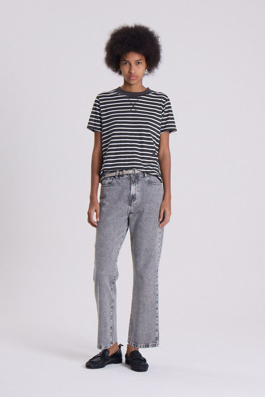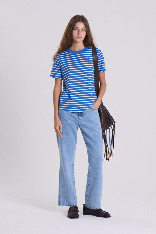 Remera A Rayas De Algodón Peruano, Con Cuello Redondo A La Base Y Bordado Central. Tiene Bordado Marcario En El Delantero. 100% Algodón Peruano