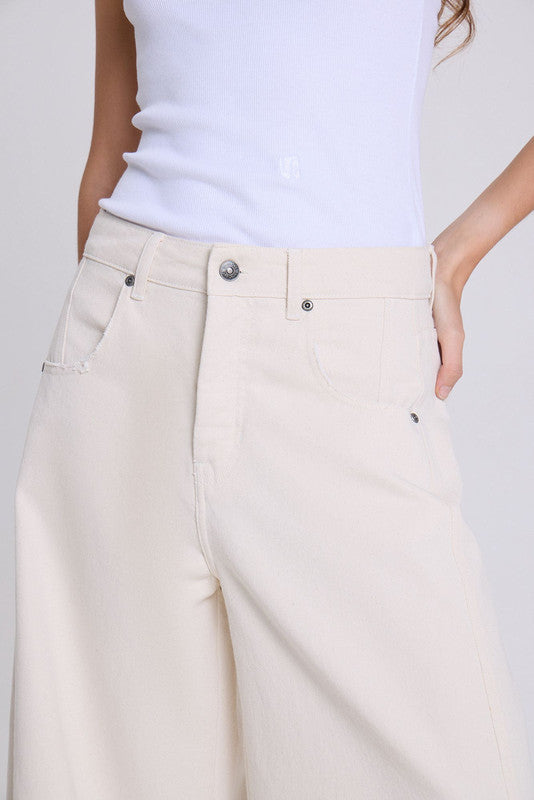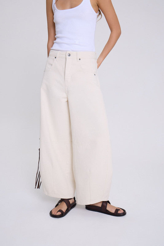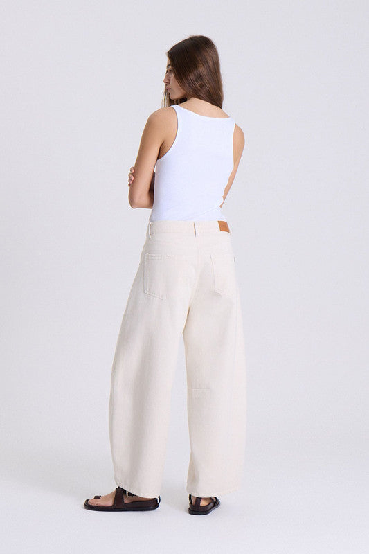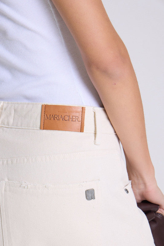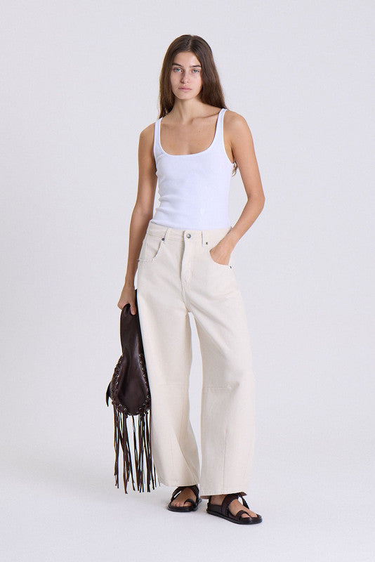 Jeans Barrel, Con Piernas Ligeramente Curvas Y Amplias, Con Recorte Horizontal A La Altura De Las Rodillas Que Acentúa El Diseño. Largo Crop. Confeccionado En Bull 100% Algodon