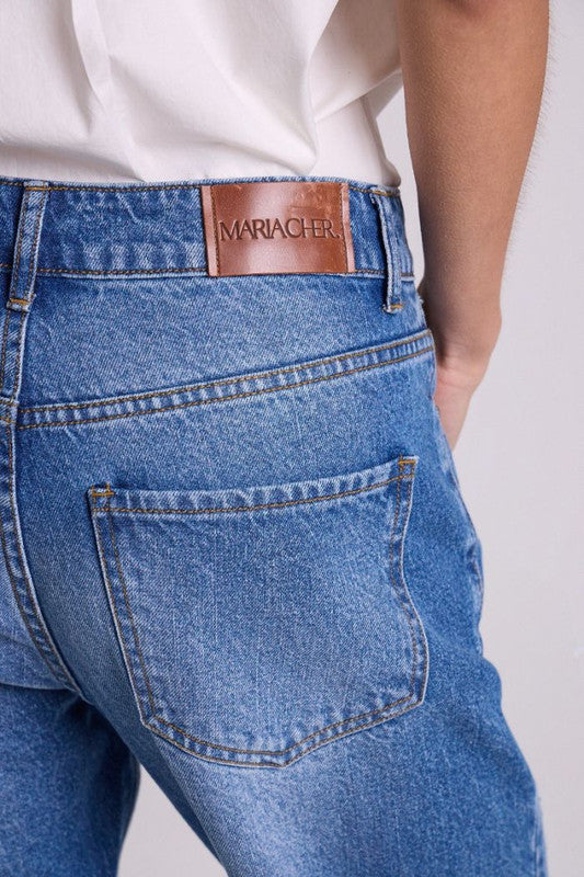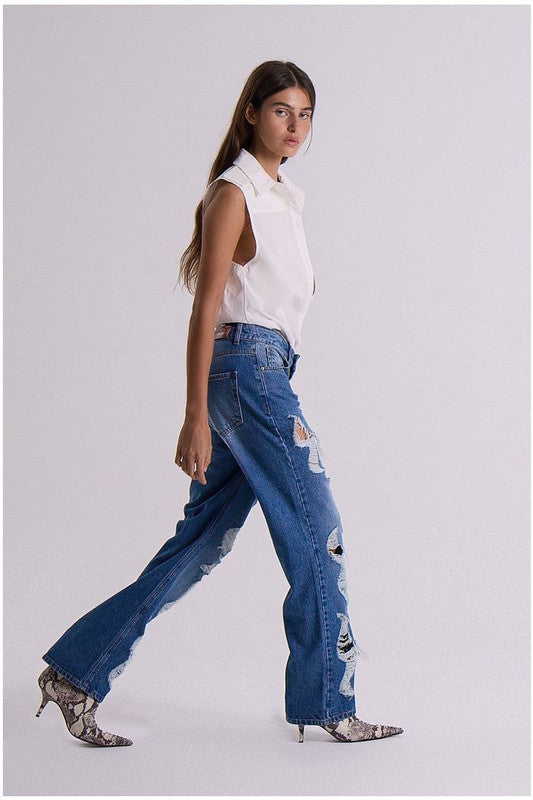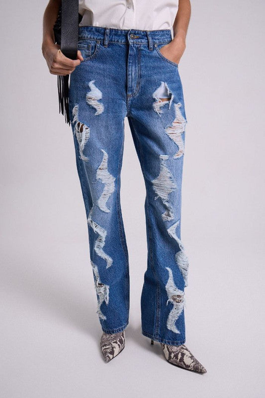 Jeans De Calce Straight, Estilo 90´S. Tiro Medio-Bajo, Pierna Recta. Se Destaca Por El Diseño De Sus Roturas En Forma De Ondas A Lo Largo De Ambas Piernas.