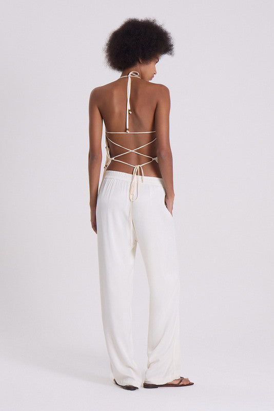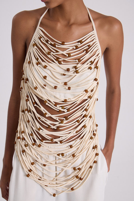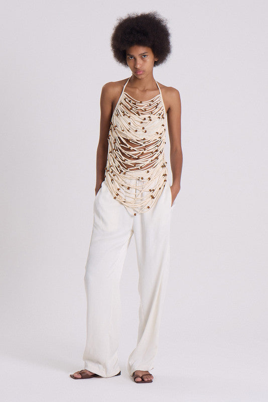 Este Top Se Construye A Partir De Una Trama De Tiras Entrelazadas Con Cuentas En Contraste Que Generan Un Efecto Artesanal Y Escultórico. El Diseño Halter Deja Los Hombros Al Descubierto Y Aporta Una Impronta Fresca, Mientras Que La Disposición Irregular De Las Tiras Sugiere Movimiento Y Profundidad. Es Una Pieza Que Funciona Como Protagonista Dentro Del Look, Pensada Para Resaltar Sobre Bases Neutras O Para Integrarse En Estilismos De Noche Con Un Aire Experimental. Viscosa 100%