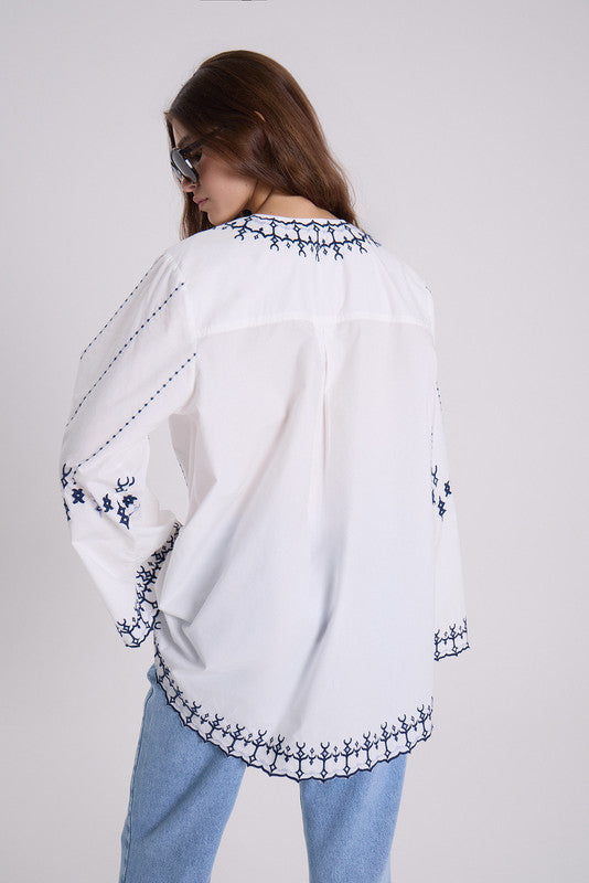 Camisa Manga Larga Escote V. Esta Confeccionada En Poplin De Algodón. Posee Bordado En Delanero Y Espalda. Calce Oversize. Algodón 100%