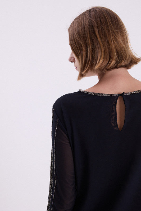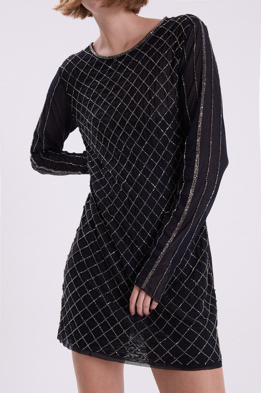 Vestido Manga Larga De Mesh Bordado A Mano Con Mostacillas. Posee Forreria. Su Calce Es Fit. 30% Nylon 70% Lycra