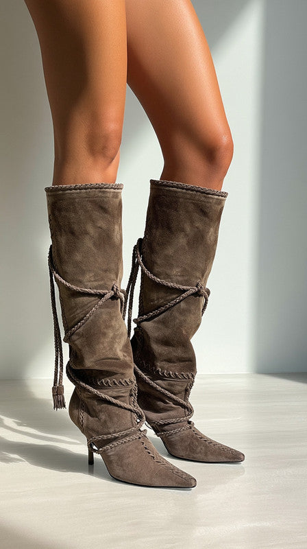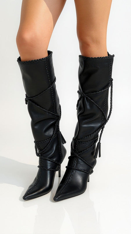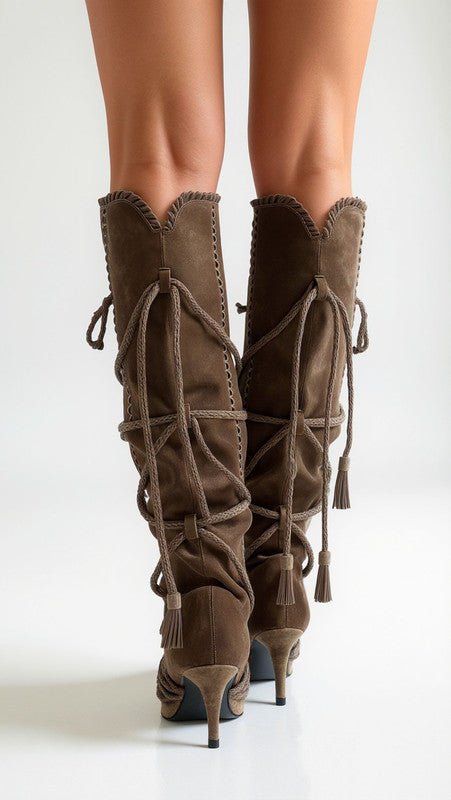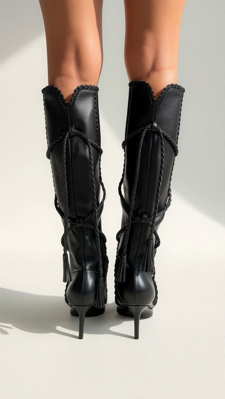 Bota De Cuero Caña Ancho Con Tiento Trenzado A Mano. Interior Forrado. Taco Forrado En Cuero De 8cm. Plantilla Confortable. 100% Cuero Vacuno 100% Cuero Vacuno