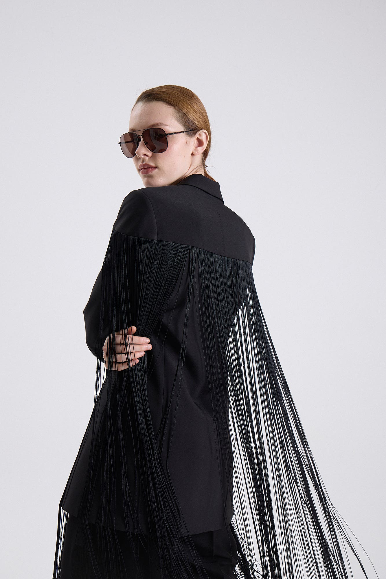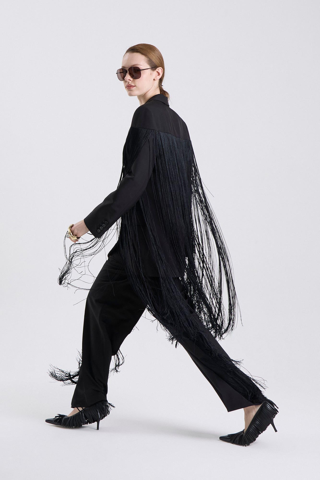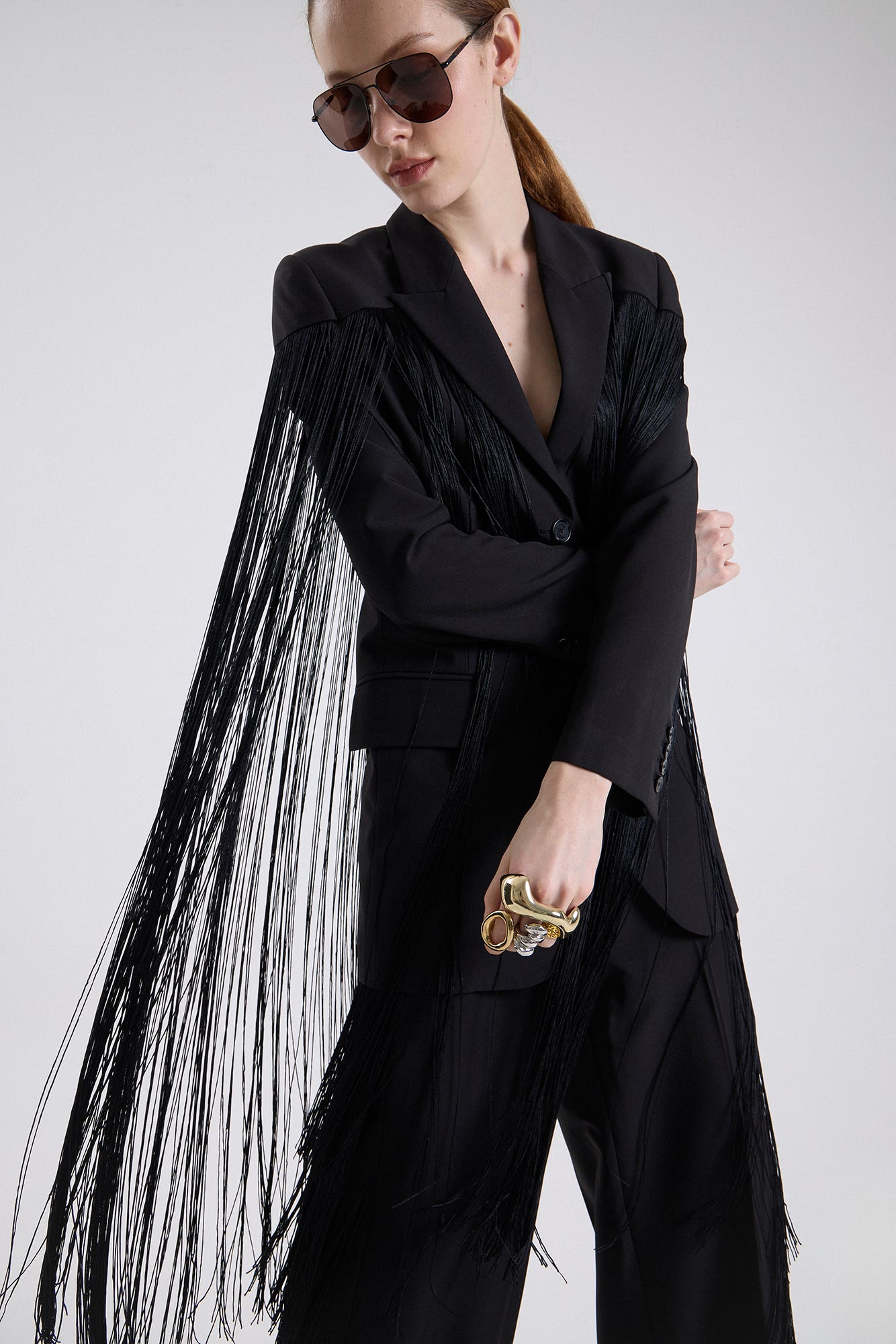 Saco Sastrero Con Cruce Al Centro. Detalle De Flecos Aplicados Desde Los Hombros Que Aportan Movimiento Al Diseño. Una Silueta Limpia Y Definida.Poliéster 96% Elastano 4% / Forrería Acetato 100%.