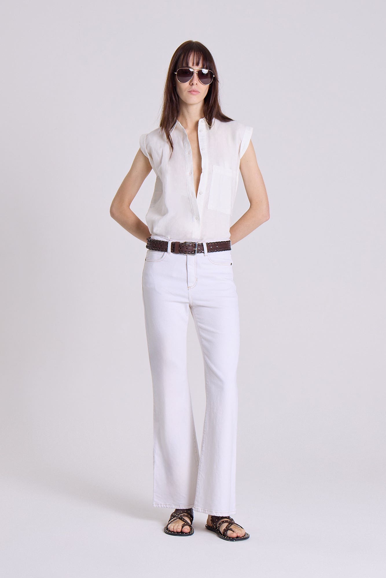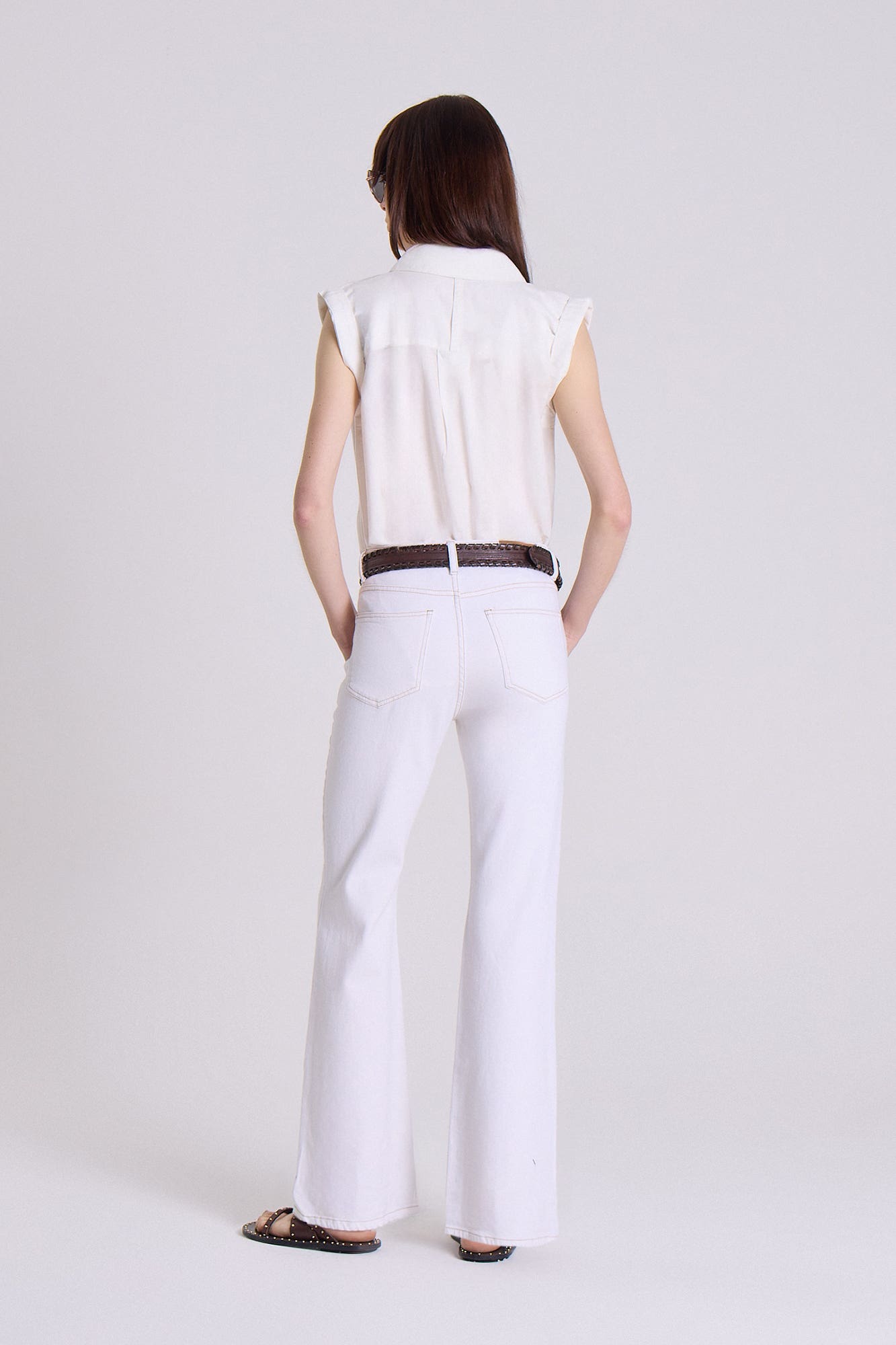 Jean Cher. Blanco De Calce Slim Con Bota Flare. Tiro Medio Alto Que Estiliza La Figura Y Realza La Cintura. Confeccionado En Denim Con Spandex Y Costuras A Camel A Contratono. El Tono Blanco Pleno Lo Convierten En Un Básico Versátil Y Atemporal.