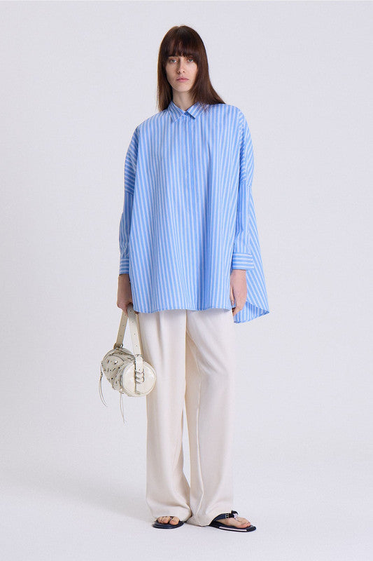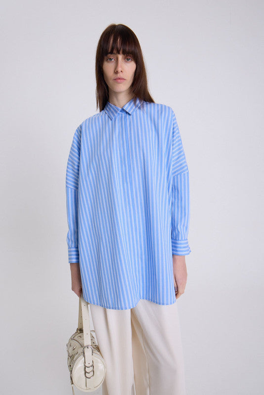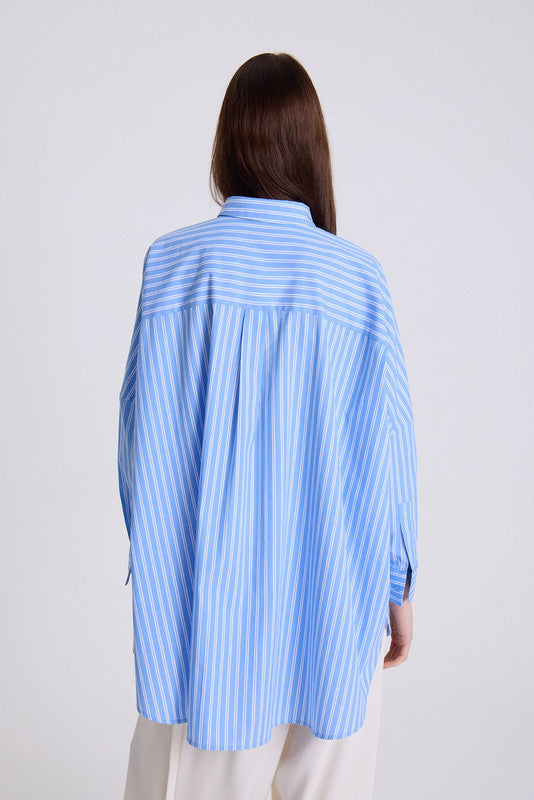Camisa Rayada De Poplion De Algodón, De Calce Oversize. Cuello Y Puño Camisero. Cartera En Centro Delantero, Con Botones Ocultos. Detalle De Logo Bordado En Puño De Manga. Algodón 100%