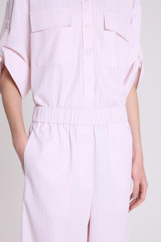 Pantalón Cher. Rayado De Poplin Algodón - Poliester, De Calce Recto. Cintura Elastica. Bolsillos Ocultos En Lateral. Tajo En Ruedo En Laterales. Detalle De Logo De Marca Bordado A Tono. 60% Polyester 40% Cotton